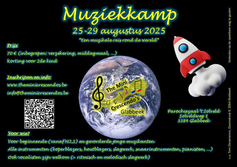 Onze (digitale) flyer voor het Muziekkamp, georganiseerd door The Mini Crescendo's Glabbeek, is beschikbaar.